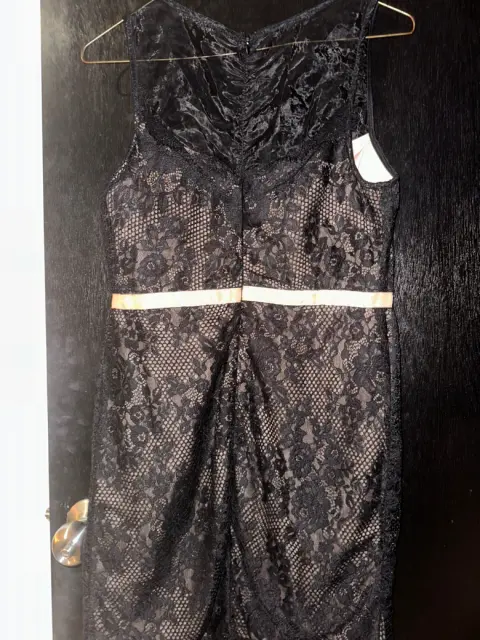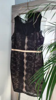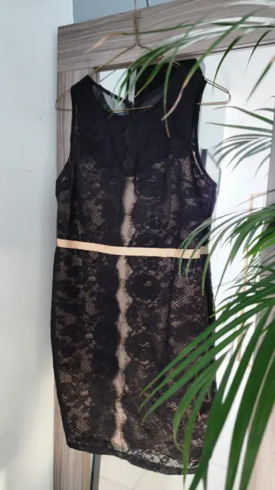 Vestido negro con encaje. Vestido negro talla M la tela no estira pero amolda bonito tiene encaje sobre fondo beige