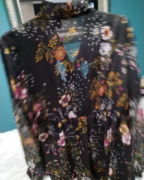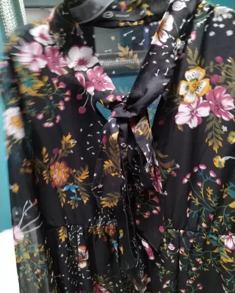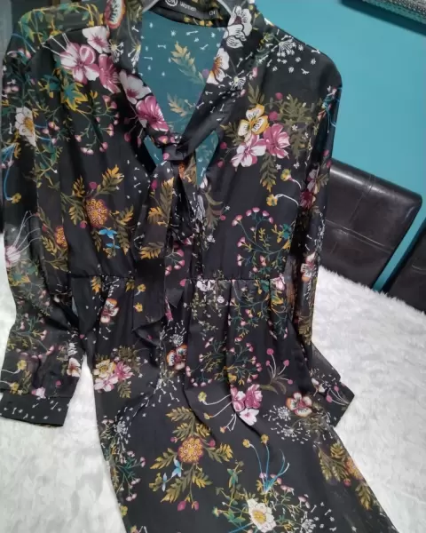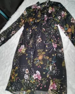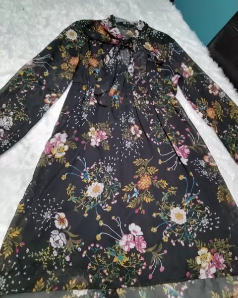 Vestido negro con flores 👌💝👌. Vestido de tela vaporosa con flores, manga larga y cintas en el cuello para hacer moño super cómodo llega a la rodilla, tiene forro es talla chica que abarca talla 5 a 7 la tela no estira es fiel a su talla nuevo sin etiqueta 👌💝🤩💌💞💕😜