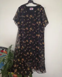 Vestido negro con flores café , semi transparente con fondo negro y olán en la parte de abajo , fresco , cuello en v, manga corta ...