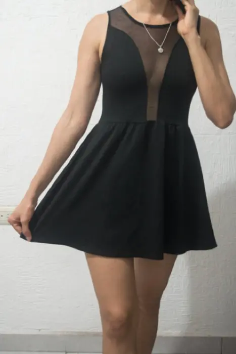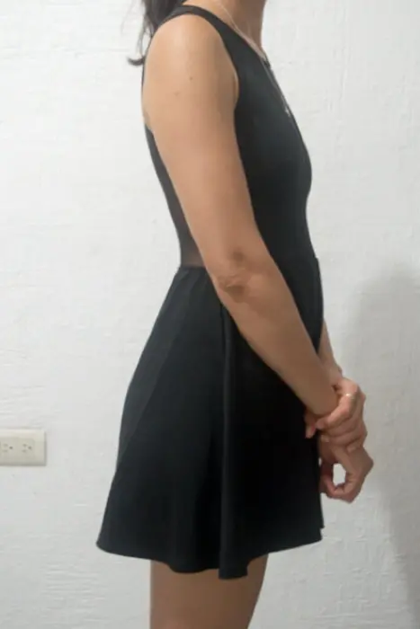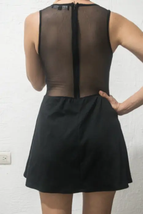 Vestido casual negro, sin manga, cuello redondo.100% nylon.Cierre de Pull on.La tela es ligeramente elástica, y es suave y cómoda. No tiene detalles, no está rotó ni tienen manchas.