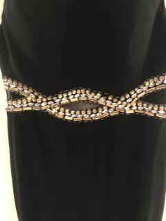 Vestido negro de noche con forro y copas.Abertura de lado izquierdo.Detalle en cintura de pedrería