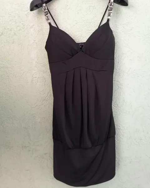Vestido corto de noche, color negro, ajustado por la parte de abajo, escote tipo V, de tirantes tipo spaghetti con detalles en pedrería, tiene almohadillas para usar sin brassiere. En perfecto estado, talla chica.