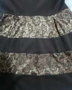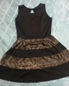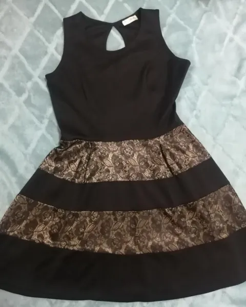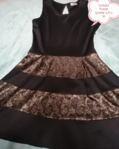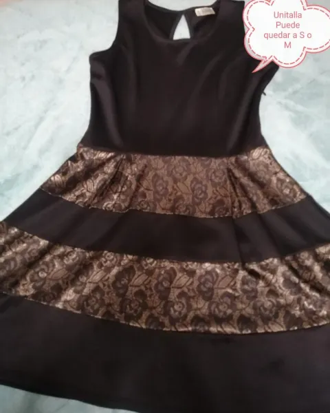 Vestido corto negro con encaje dorado, cuenta con cierre al costado. Son detalles, unitalla queda a S o M.