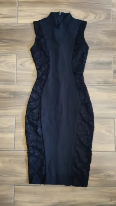 Vestido negro entallado abajo de la rodilla. Vestido abajo de la rodilla, entallado, forrado, con detalles de encaje también en color negro
