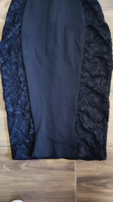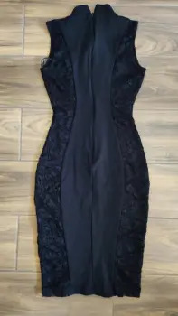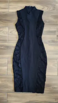 Vestido abajo de la rodilla, entallado, forrado, con detalles de encaje también en color negro