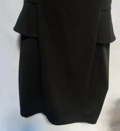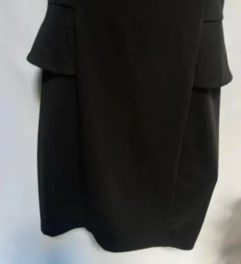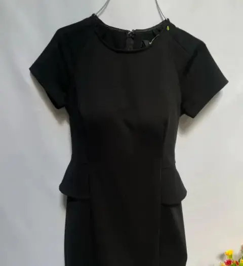 Vestido negro escote redondo, pinzas de busto en corte francés. Pequeño olan en en costado que abarca de pinza a pinza dela parte de la espalda. Manga ranglan corta y pinzas en hombro, cierre invisible y broche de seguridad. Falda corte lápiz. Talla: XS (22-24) Marca: MOSSIMO.