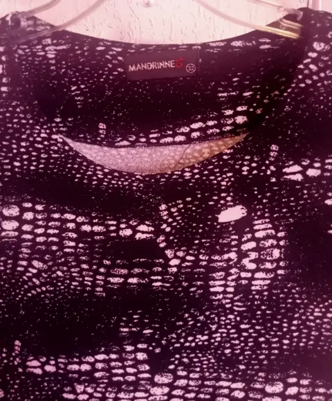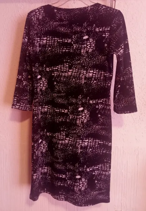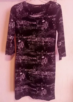 Vestido negro estampado. Vestido corto, negro con blanco. Manga 3/4, ajustable al cuerpo, talla 32, estampado de bolitas blancas.