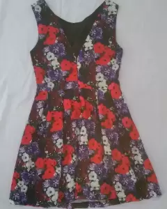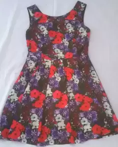 Vestido negro estampado flores. Hermoso vestido de tela ligera como satin super cómodo, corte en A con pastelones. Cuello V en la espalda, y cuello circular por la parte de fte.corto hasta la rodilla.