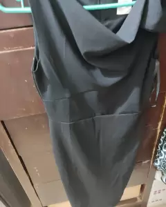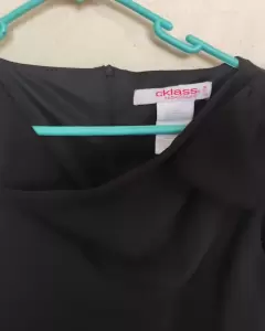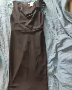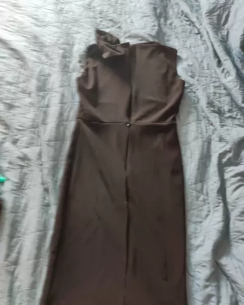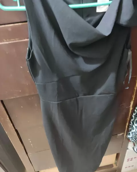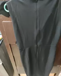 Vestido nuevo sin etiqueta estuvo guardado nadie lo uso está en buenas condiciones nuevo talla chica con un moño arriba del hombro derecho con cierre el cierre le sirve el color negro está bien está perfecto está elegante para una comida