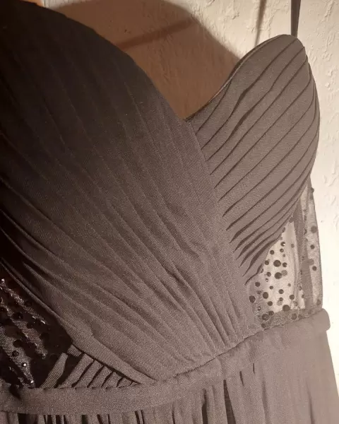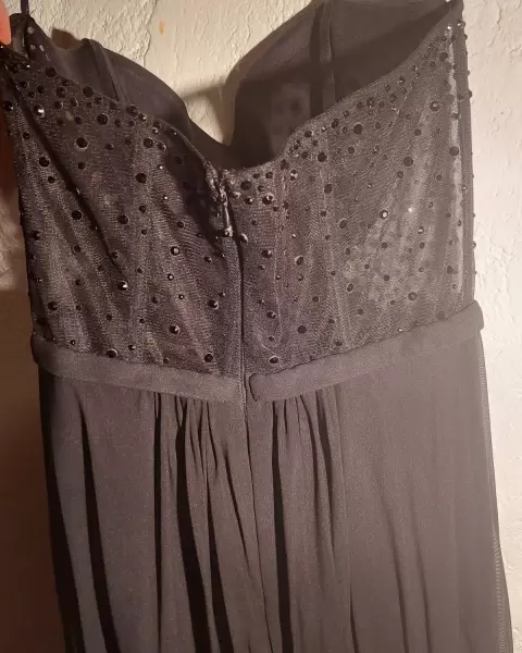 Vestido negro largo. Largo estraple, cierre en la parte trasera.Elegante plizado en busto talla M.