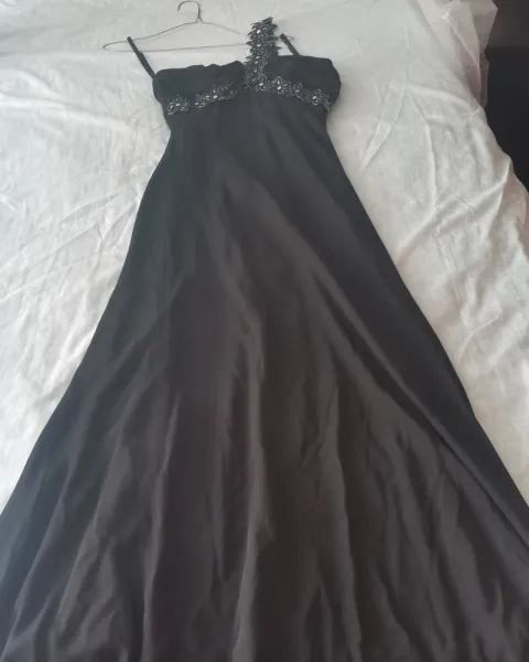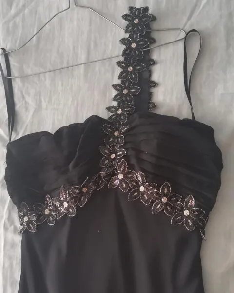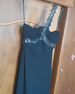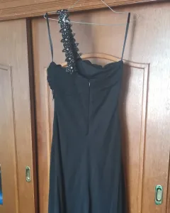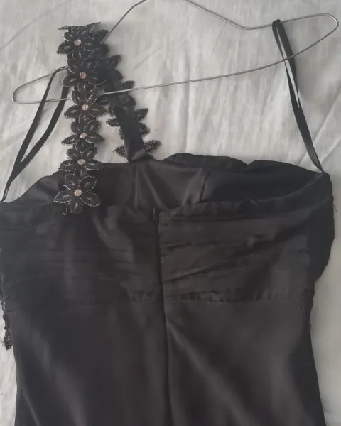 Vestido de fiesta negro talla chica, un solo tirante con detalles de lentejuelas que no se cae al momento de llevar a la tintorería. Tiene muy buena caída y da forma al cuerpo