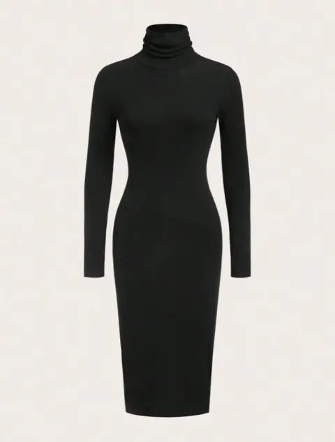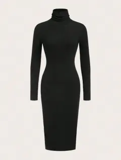 Vestido negro largo, mangas y cuello de tortuga, súper elegante, talla mediana a grande. Para cualquier ocasión.
