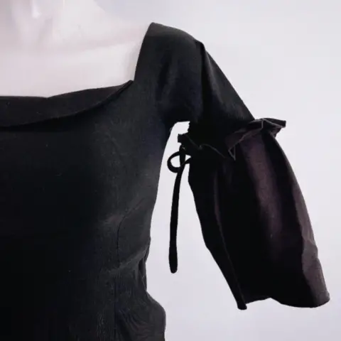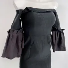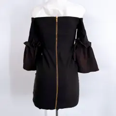 Lindo vestido negro off-shoulder, con mangas 3/4 amolias con cordón en forma de moño para ajustar. En la espalda cuenta con un cierre completo dorado. La tela es tipo strech.(largo desde la cintura 63cm)(cintura alta bajo busto 43cm, largo debajo del busto 53cm)[Medidas Maniquí: Busto 90 - Cintura 65 - Cadera 98]