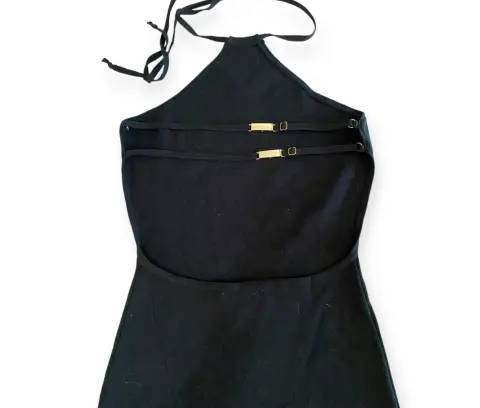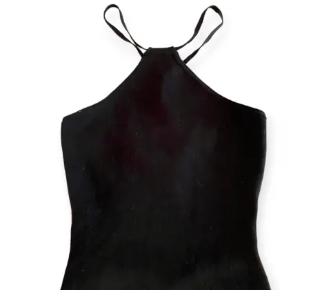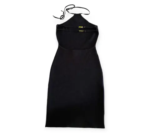 Vestido negro pegadito con cuello halter, espalda descubierta con broches dorados, tejido de punto, no se transparenta para nada la tela está de súper buena calidad te hace una figura muy bonita, súper bien para fiesta