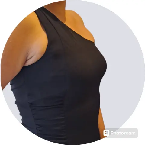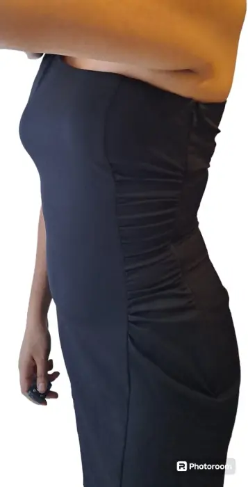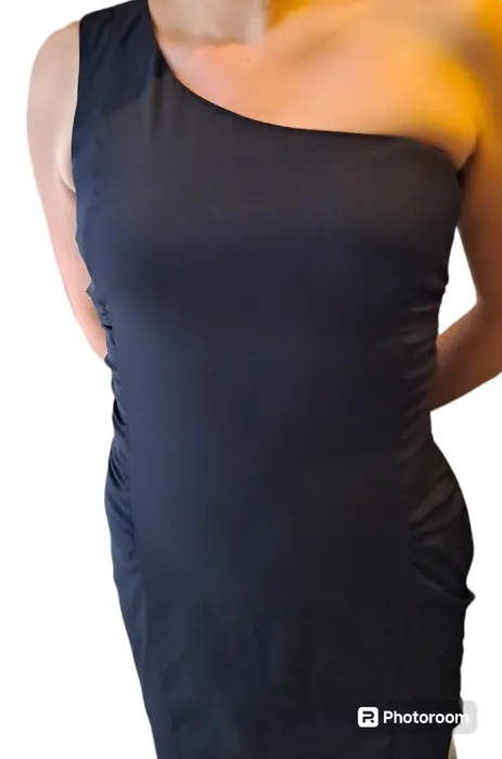 Vestido negro de un solo hombro, queda pegadito al cuerpo, con pliegues en la caderas para dar volumen en esa zona, tiene un cierre largo en el lateral con un broche para cerrar el vestido.Considero que es talla 30 a 3290cm de largo40cm de axila - axila35cm ancho cintura