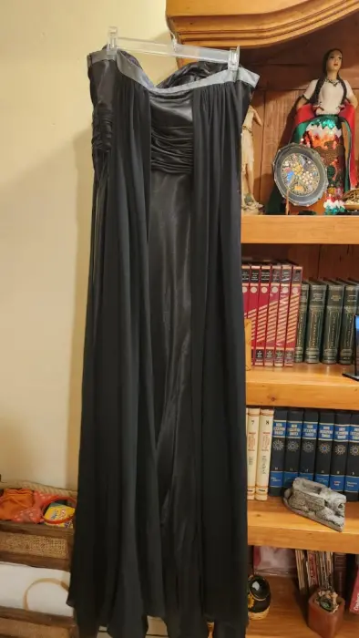 Vestido negro satinado con gasa sifilo gris plata, talla 8 petite