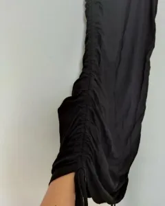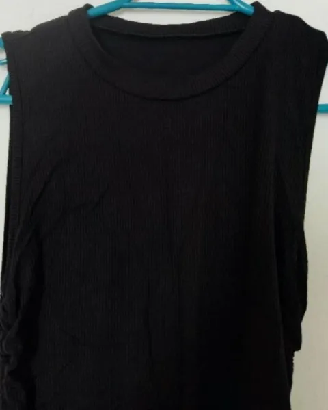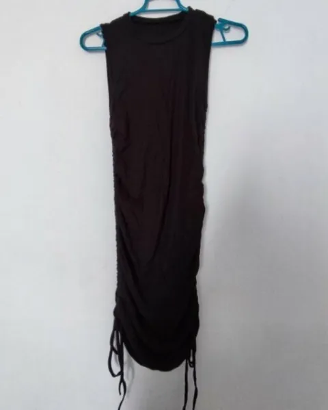 Hermoso vestido negro sin mangas, el cuello es muy lindo.Tiene lazos a los lados para fruncir y ajustar el largo, se ve hermoso, jamás lo usé, la tela es delgada.
