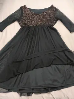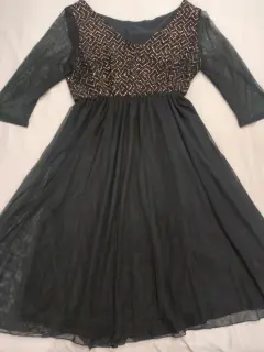 Vestido Negro talla 2XX. Vestido Negro combinados con tela con destellos brillantes color dorado mangas y falda transparente con forro en falda y elástico en corte falda y blusa