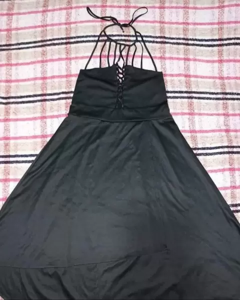 Vestido negro tela strech. Vestido marcado XL, queda perfecto a 2XL.No lo usé porque me quedó muy grande. Tela strech.