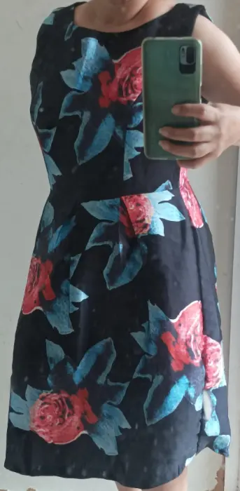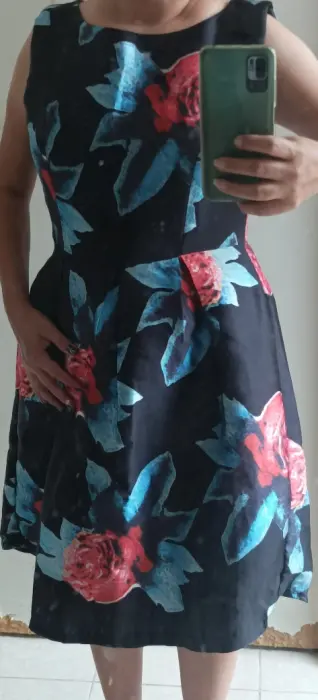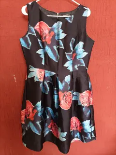 Vestido negro/flores. vestido negro con flores, cuello redondo, con forro, poliéster, con cierre en la parte de atrás.
