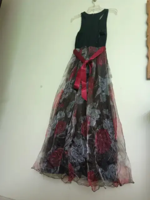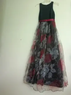Vestido largo con fondo negro con flores blancas y rojas cuenta con listón rojo y malla en la parte superior para dar volumen cierre en buenas condiciones en la parte posterior