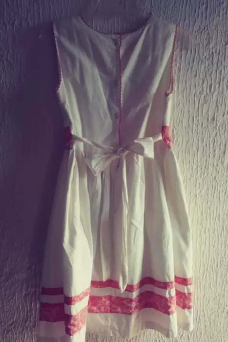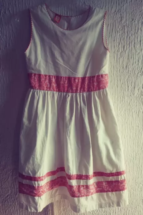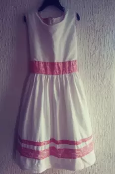 Vestido Niña Crema y Rosa. Vestido sin manga talla 10 añosComposición: 90% algodón, 10% Poliestér. Forro: 100% Poliestér. Tipo manta. Ideal para esta temporada primavera-verano. Vestido fresco y cómodo, abajo de la rodilla y forro