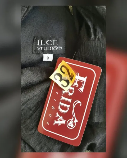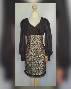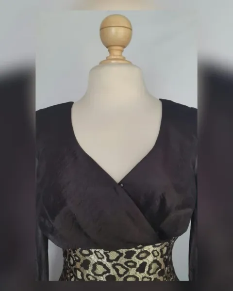 Vestido semi stretch de noche corte sheath tono NEGRO ÉBANO c/estampado ANIMAL PRINT bitono NEGRO/DORADO, escote cruzado, manga larga terminada en puño, cierre p/cremallera lateral y forro interior. Talla 32. Dimensiones cms: 35 hombro, 48 axila, 39 cintura, 50 cadera, 49 ruedo, 30 largo ruedo, 59 largo, 89 largo total, 64 largo manga. 78% poliéster, 19% rayón, 3% spandex. P/lavado en casa.