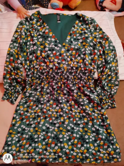 Vestido corto (arriba de la rodilla) talla XG, manga larga, color verde con flores, escote cruzado