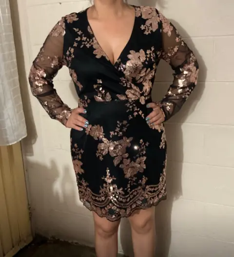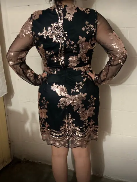Vestido corto talla XLManga larga semi transparenteCon detalles de lentejuelaNo estira No pica la tela porque trae forro y no se transparenta