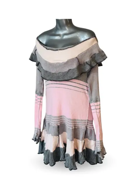 Vestido desombrado estilo gótico Coquette.Da la impresión como si fueran retazos de tela al revés.Tejido de punto y partes brillosas, rosa con gris.La parte de los hombros es muy escotadaTalla XL