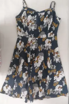 Bonito vestido Old NaviCaída corte ATalla MMedidas largo de la falda a partir de la cintura: 55cm.Color azul petróleo con flores en crudo y café.Los tirantes son corredizos