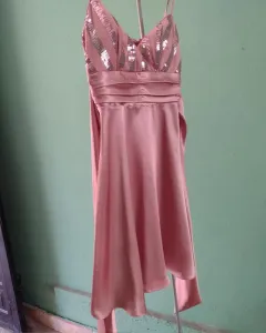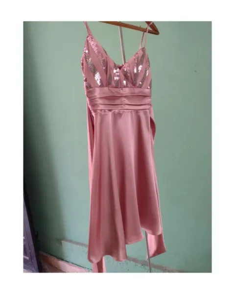 Vestido Palo de rosa. Escote en V, vestido de seda con pliegues en cintura y lentejuelas brillantes en zona de busto