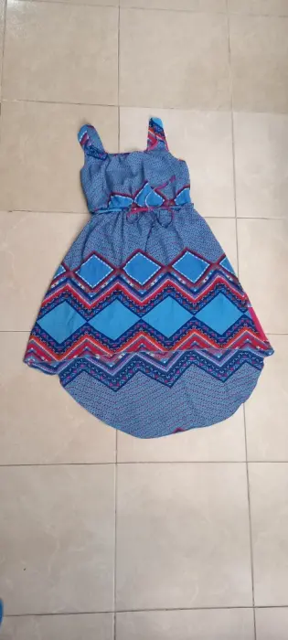 Vestido paper doll talla 8. Vestido para niña marca paper doll talla 8, con estampado geométrico alto y bajo, azul y fucsia Dobladillo alto y bajo Elástico en la parte superior de la espalda Jersey Cintura elástica con cinturón para anudar 100% poliéster, nuevo sin etiqueta