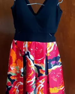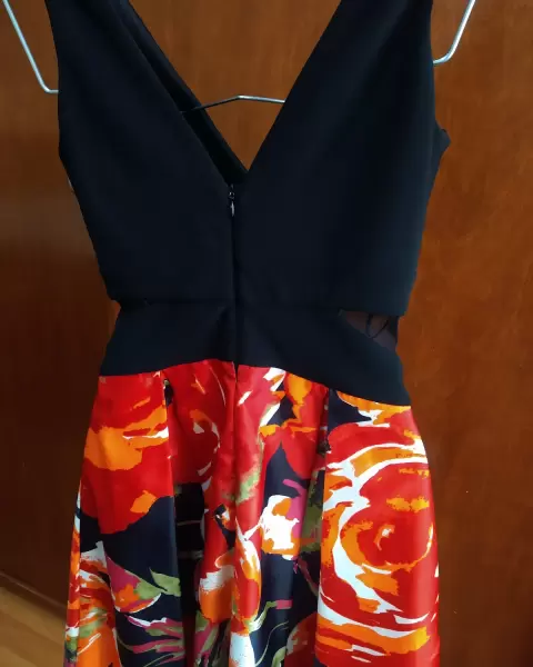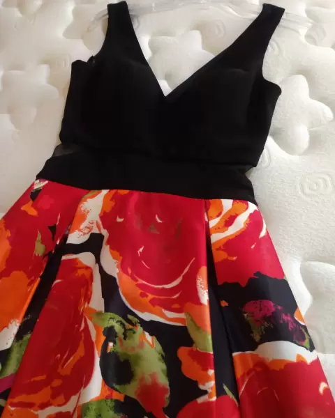 Bonito vestido negro con falda multicolor con flores, ajusta muy bonito cintura y escote, la falda tiene bolsas.