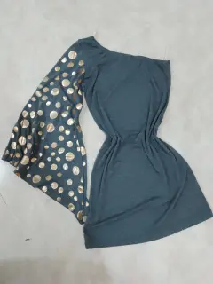 Vestido color gris, altura a la mitad de la pierna, sin una manga, con detalles dorados en la manga, unitalla, tela de licra, ligera, como y muy elegante