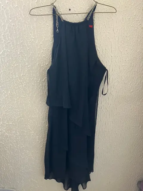Vestido corto con tirantes de cadena , tipo halter ,caída esgada, corto .Color azul marino
