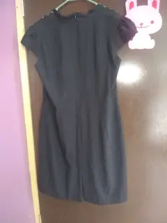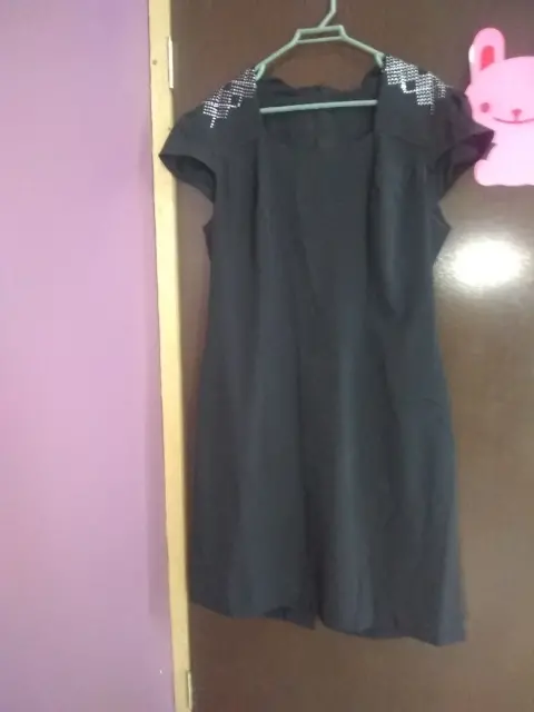 Es un hermoso y elegante vestido negro, llega arriba de la rodilla o si eres bajita a la rodilla tiene una pequeña y sexy abertura en la parte posterior y cuenta con un cierre, en la parte de los hombros tiene como detallitos plata y cuello redondoLa manga es linda es pequeña con un olancito.