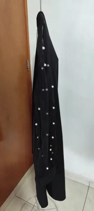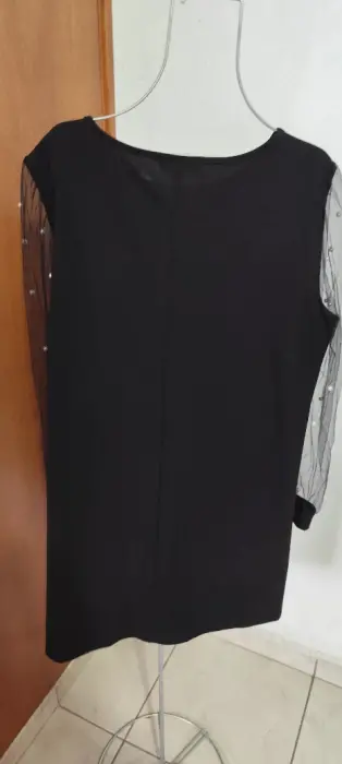 Vestido negro super bonito y cómodo con las mangas de gasa y decoración en perlas.Largo 94 CmsPecho 57 Cms
