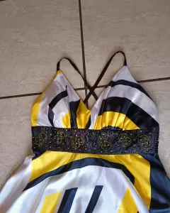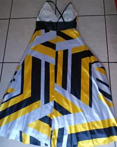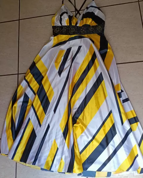 Vestido largo para fiesta, de tirante cruzado por la parte de atras, escote en V, tiene un conto de canutillo muy bonito, caida en A. Talla 14Sin detalles.