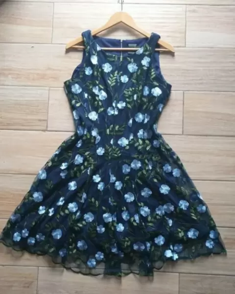 Hermoso vestido en color azul marino con encaje bordado de flores en color azul cielo.Tiene forro la falda, ideal para una fiesta en jardín.