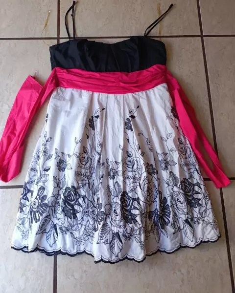 Vestido para Fiesta de día, de tirantes delgados, con un bordado de flores negras muy bonito, largo arriba de las rodillas. Talla M