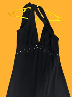 Vestido, cuello Halter con espalda descubierta, tiene forro, pedrería al frente, tela que se amolda muy bien tu cuerpo