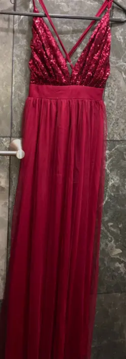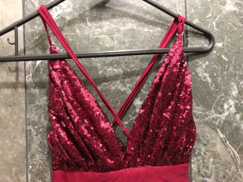 Vestido talla XS, completamente intacto sin detalle alguno, su estado de la prenda es muy bueno, color vino, con lentejuela trae un pequeño escote en la espalda que llega a la cintura y los tirantes quedan cruzados, teniendo así también una abertura a la altura de la pierna ☺️