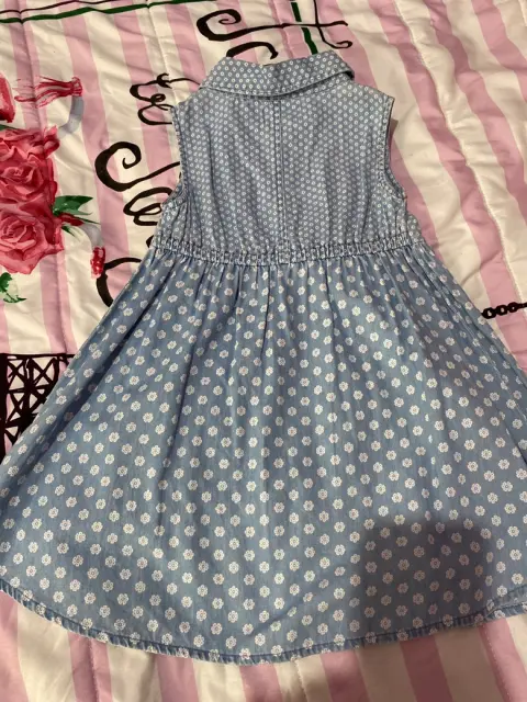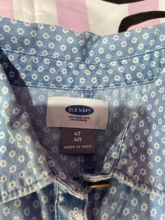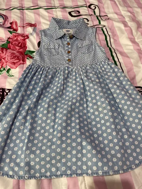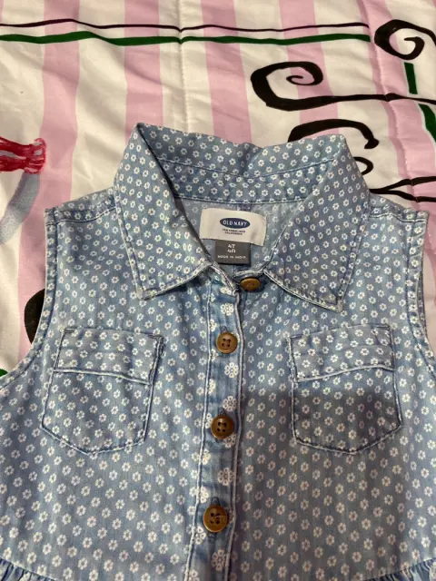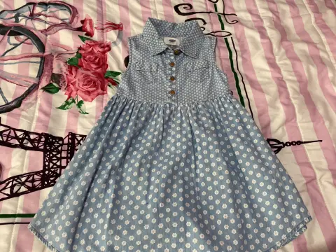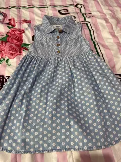 Vestido para niña old navy. Vestido para niña marca Old Navy color azul claro, talla cuatro 4 años, con estampado de florecitas, se abrocha por la parte delantera está un poco desgastado por uso