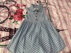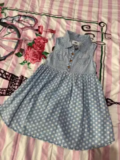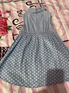 Vestido para niña marca Old Navy color azul claro, talla cuatro 4 años, con estampado de florecitas, se abrocha por la parte delantera está un poco desgastado por uso