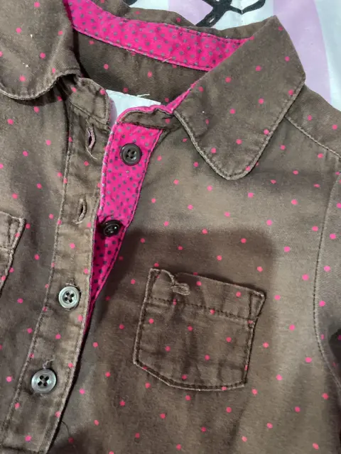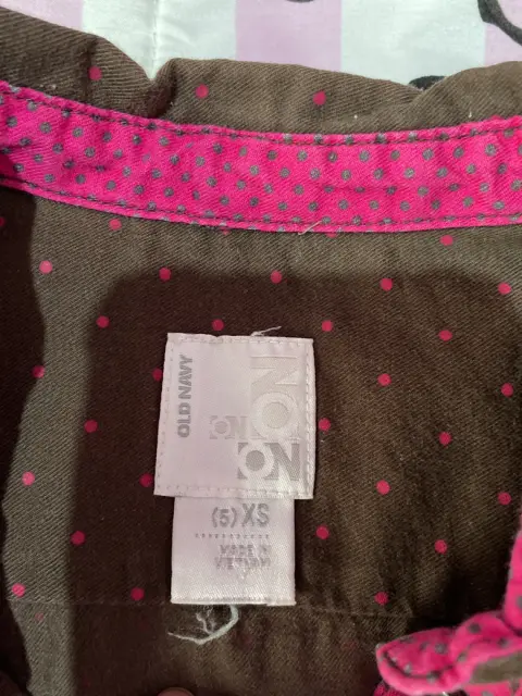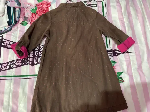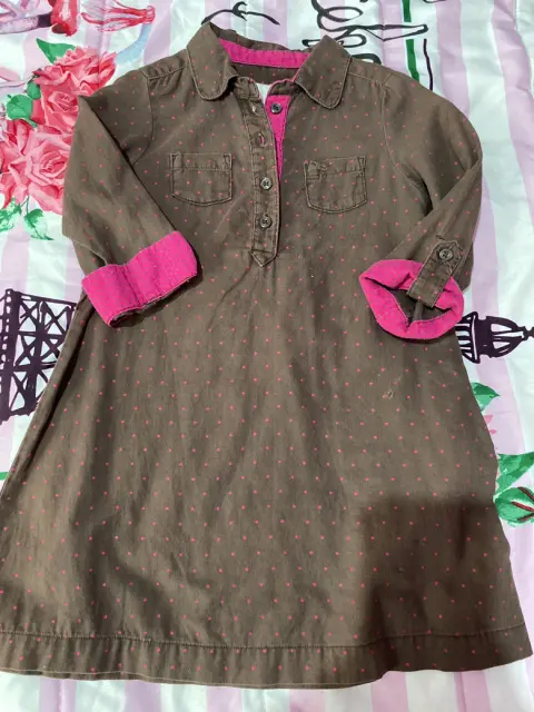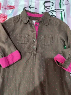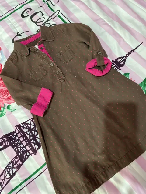 Hermoso vestido para niña marca Old Navy, talla cinco 5años, color café con puntitos rosas, tiene un detalle en la parte delantera abajo y otra en la bolsita izquierda no se ve mucho.