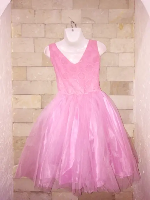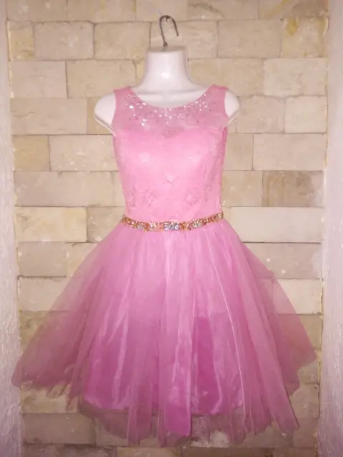 Vestido para niño de 10-12años. Vestido para niña rosa arriba encaje y abajo tuleTalla 10-12añosCorte frente de corazón con brillosCinturón de piedreria de fantasíaEs comodoTiene forro Se uso.una vez
