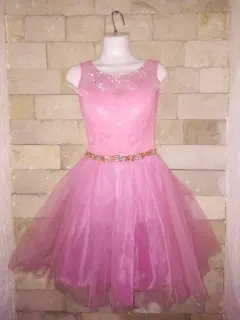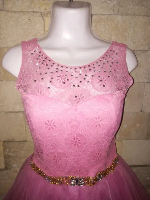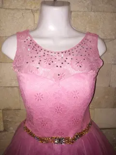 Vestido para niña rosa arriba encaje y abajo tuleTalla 10-12añosCorte frente de corazón con brillosCinturón de piedreria de fantasíaEs comodoTiene forro Se uso.una vez