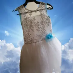 Vestido para primera comunión, talla 12 con detalles en azul que lo hace diferente y especial a lo cotidiano, una sola puesta, incluye velo con tocado con detalles florales azules.