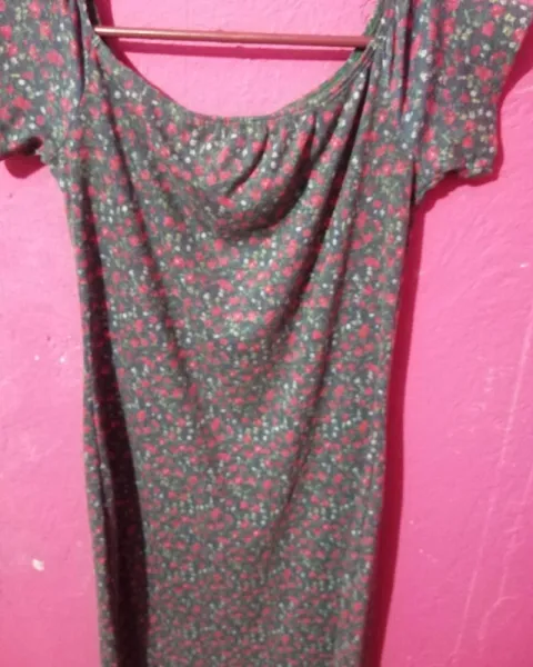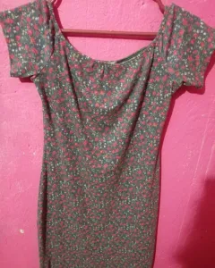 Vestido arriba de la rodilla color gris obscurito con flores rosas el diseño es de mangas al hombro, la verdad esta en super buen estado sin ningún detalle es tipo locura gruesa.